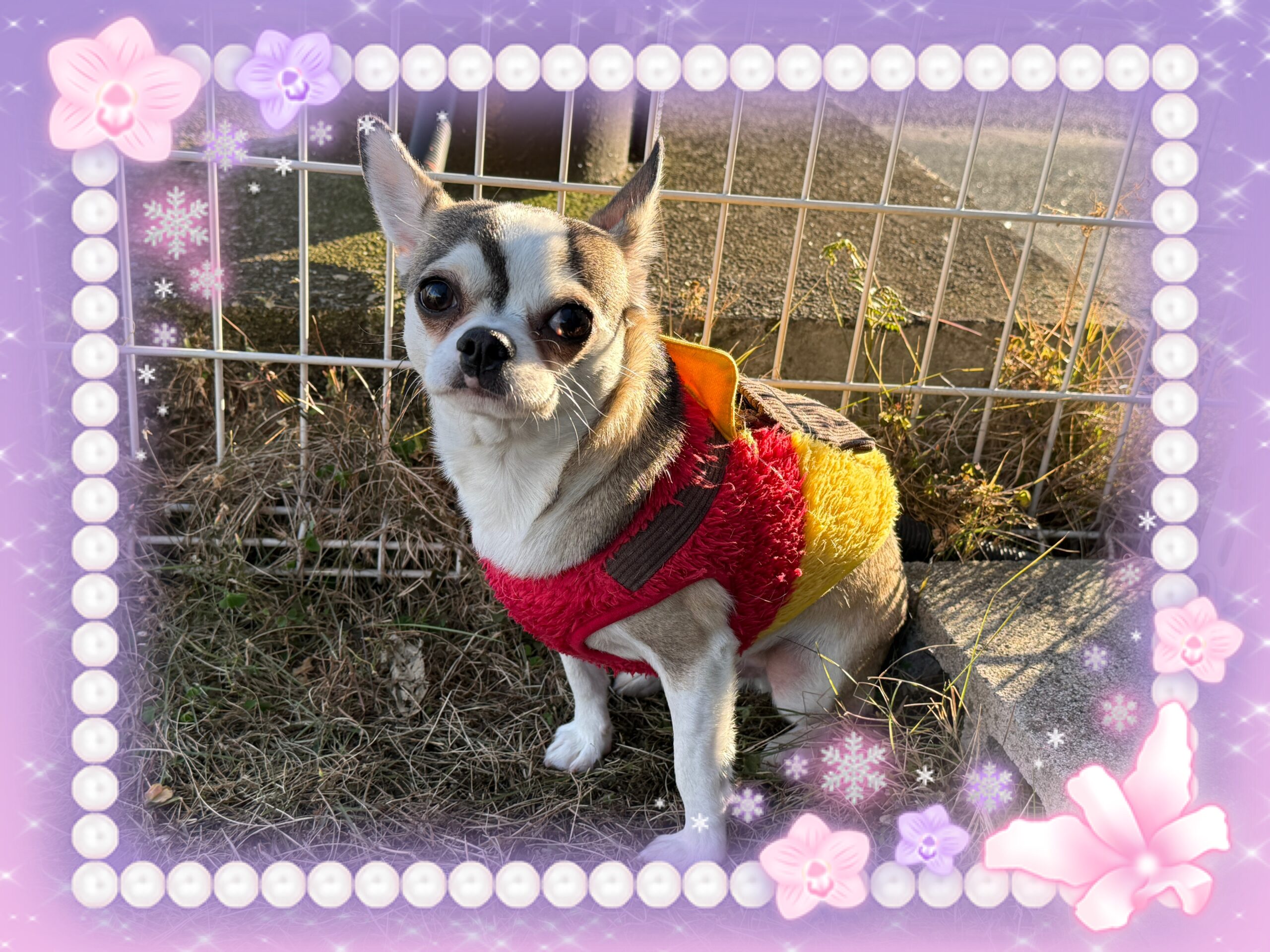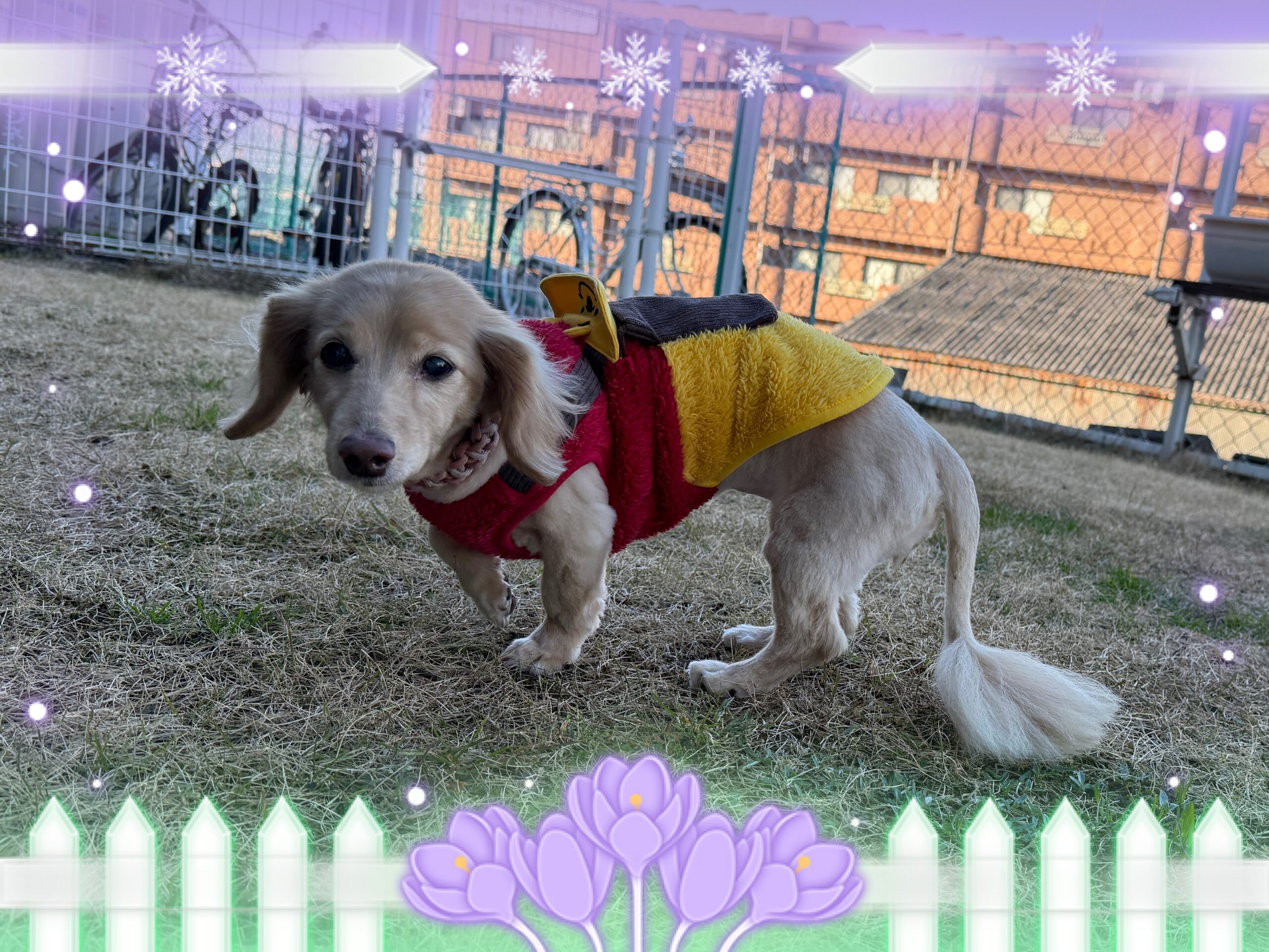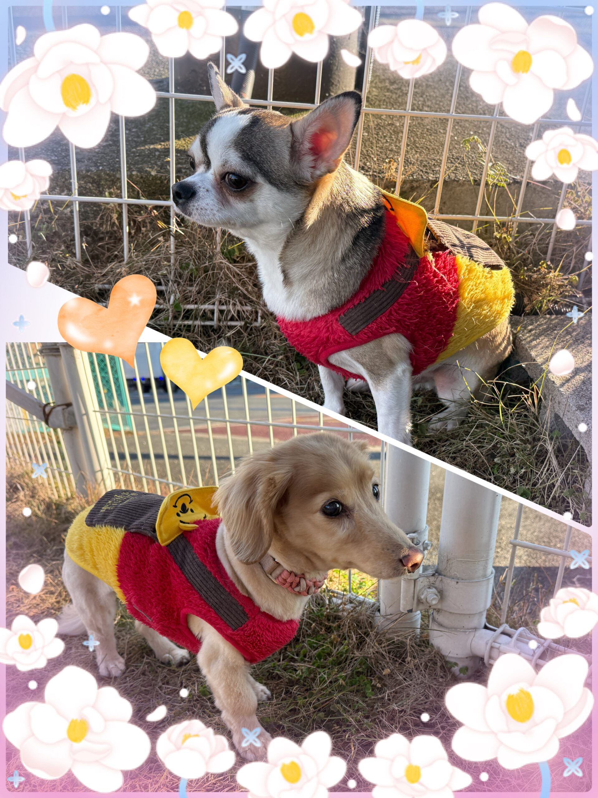 ゆずちゃん&ぶんたんちゃん ダックスのゆずちゃんと… チワワのぶんたんちゃんがお泊まり中です🍊 お揃いの服を着た柑橘コンビはご飯もトイレもバッチリです✨ ちなみに、鏡餅の上に乗ってるのは橙です🟠😂 お迎えまでゆっくりしてね🙌
