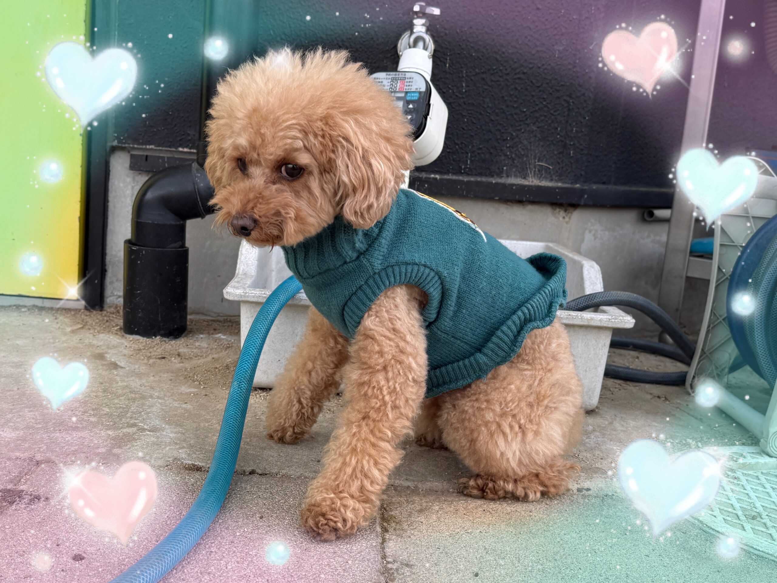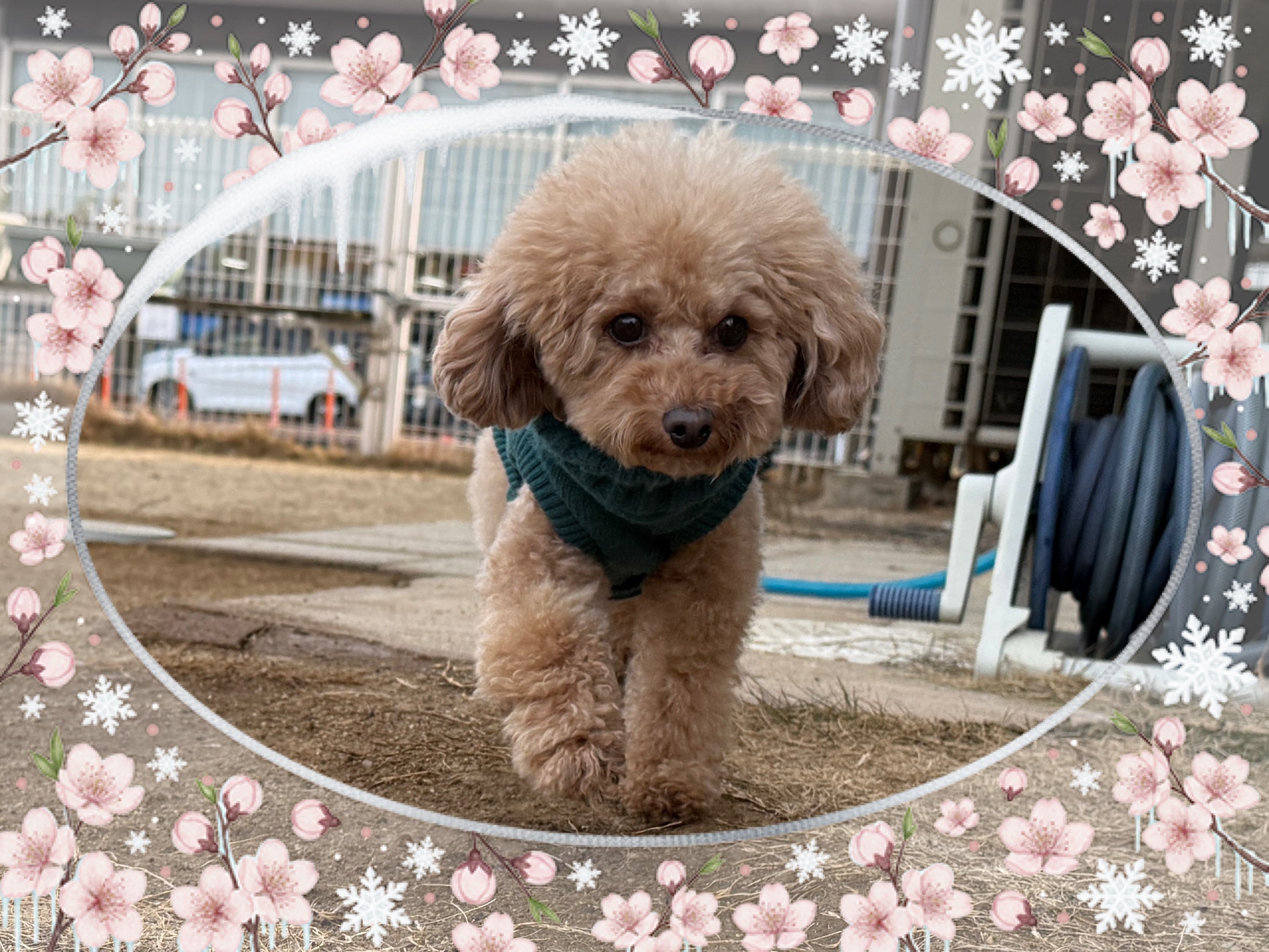 ラウレアちゃん トイプードルのラウレアちゃんがお泊まり中です! かっこいい服を着てるから寒くないね☺️ 人懐っこいラウレアちゃん、ランに出てもスタッフにピッタリでかわいらしいです🤭 お迎えまでいっぱい遊ぼうね🙌