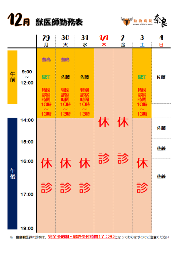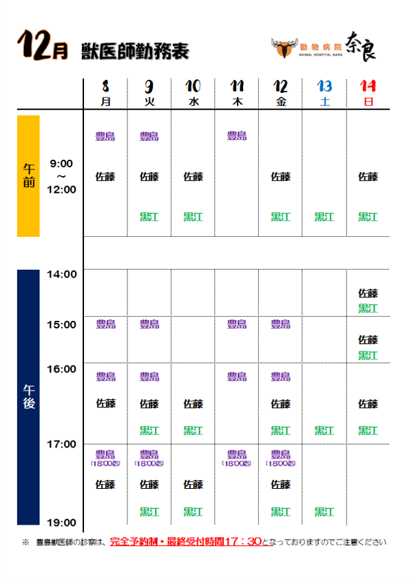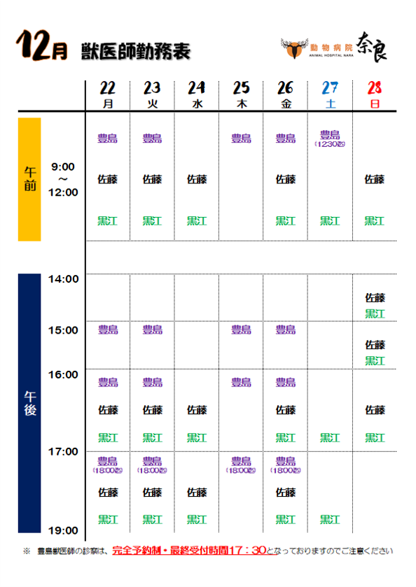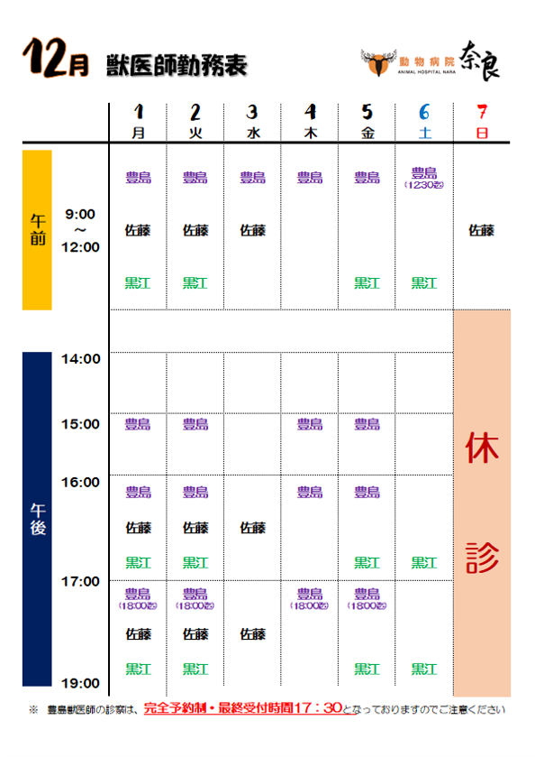 〈12月〉獣医師勤務表